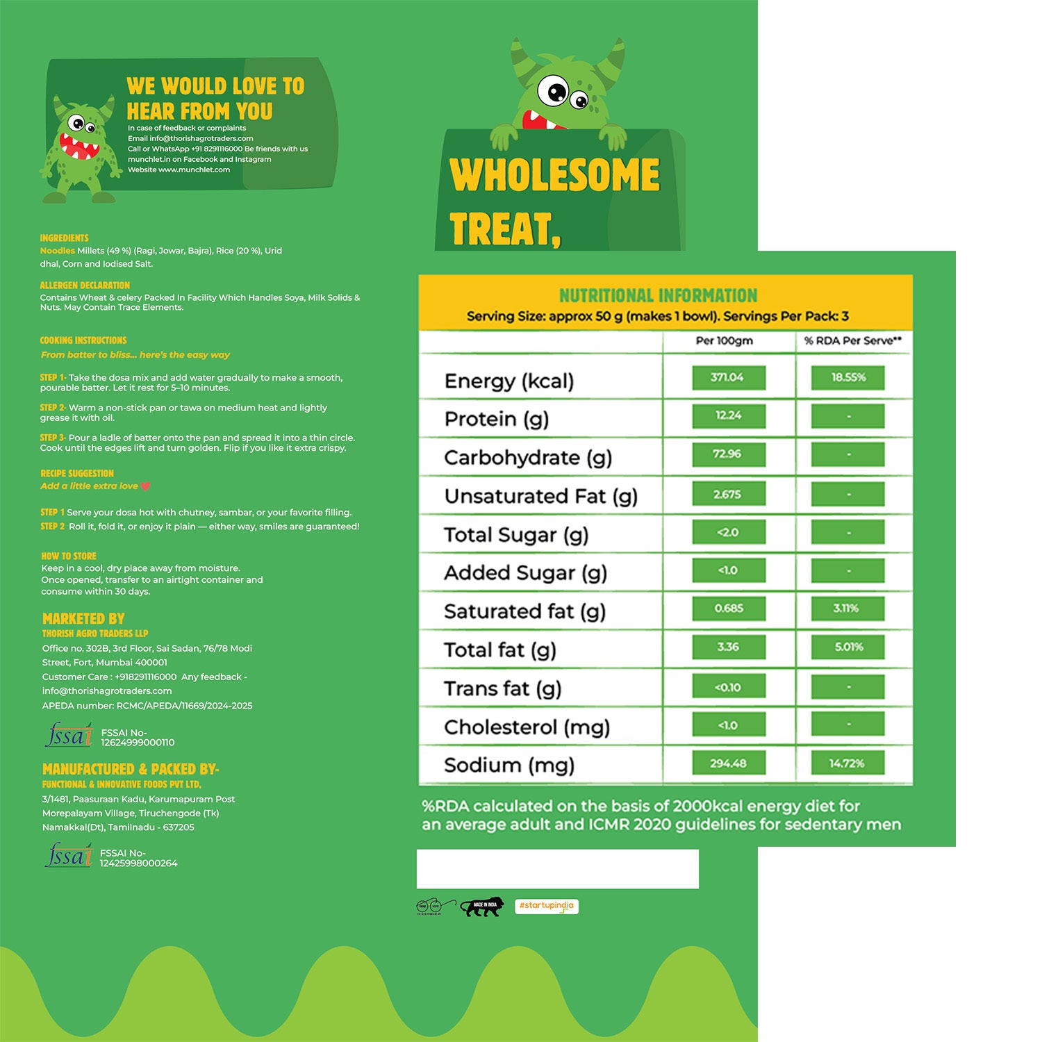- Packed in a facility that handles Wheat, Soya, Milk Solids & Nuts.