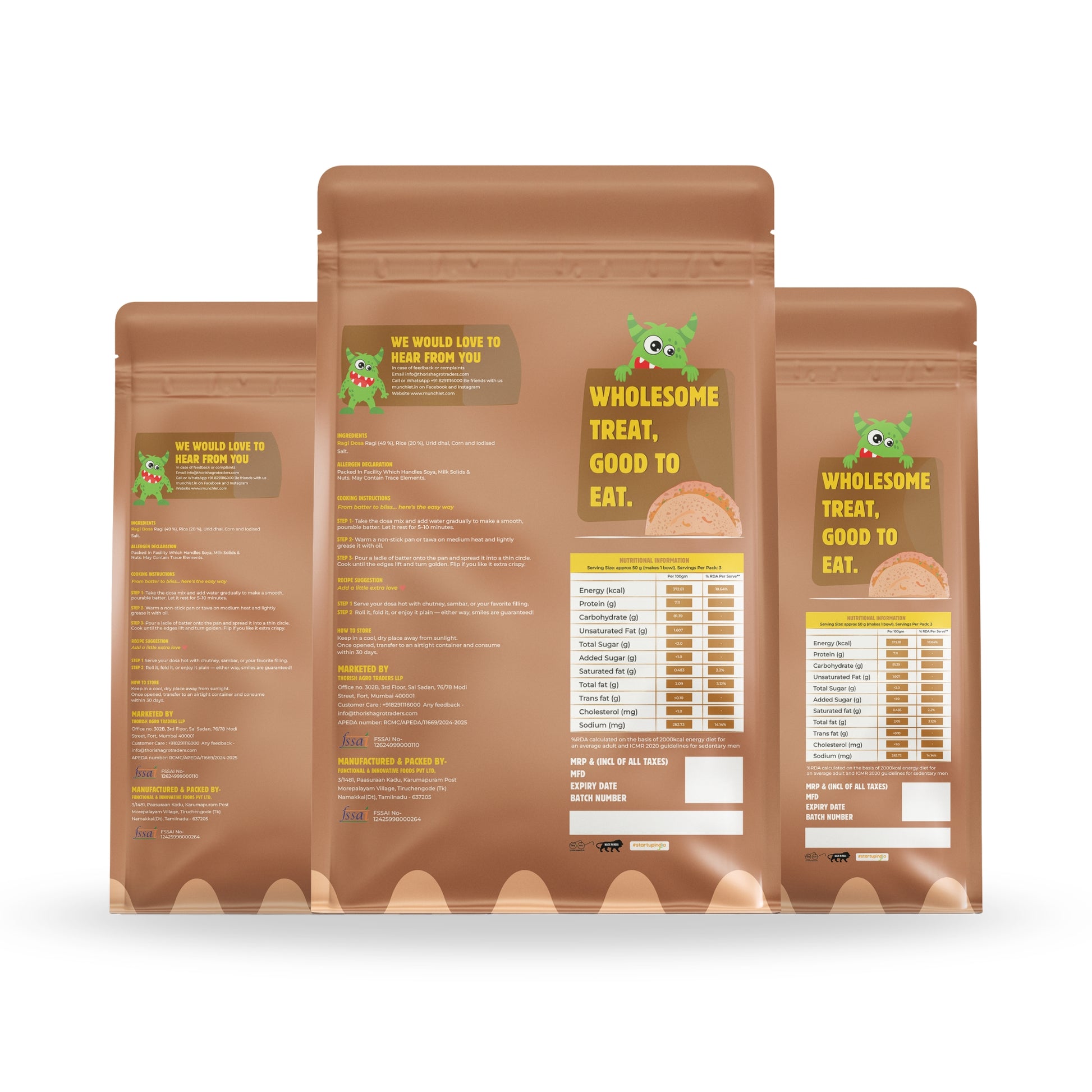 Ragi Dosa Mix is a nutritious blend made with ragi, rice, urid dal, and corn to create crisp, light, and wholesome dosas. Known as a powerhouse grain, ragi is rich in calcium and iron, making it an excellent choice for growing kids. This ready-to-use mix saves time and effort while bringing you the taste of traditional dosas with the goodness of millets.